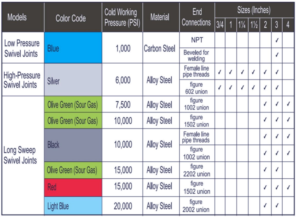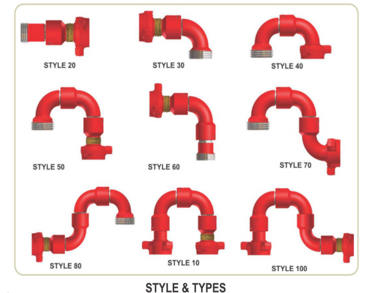Available in sizes 3/4” through 3” for 6,000 PSI, non-shock cold working pressure. All sizes available in eight styles for 360°rotation in one, two or three planes. These Swivel Joints are recommended for hydraulic control lines, mud lines, rotary, line connections, BOP lines, test lines, water lines, offshore wellhead connections, cementing, circulating hoses and choke-kill lines.